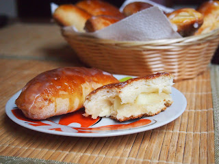 Blat lub stolnicę oprószyć mąką,ciasto rozpłaszczyć dłońmi i kubkiem wyciskać krążki.Na każdym układać jabłka i zawijać małe rogaliki.Położyć na blaszce wyłożonej papierem do pieczenia,przykryć ściereczką i odstawić na 20 minut w ciepłe miejsce.Przed wsadzeniem do pieca posmarować rozbełtanym jajkiem.Piec 15-20 minut w temperaturze 180 stopni na złoty kolor.Po upieczeniu studzić na kratce a następnie polukrować.
